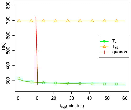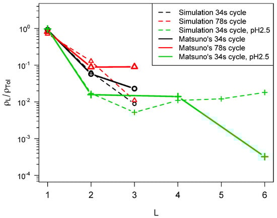 Fit of the simulation model to data from the experiments reported in references [9,10,11]. In the simulations, the high temperatures = 500 K, low temperature = 300 K, , = 108 kJ/mol, The fit yields s for Matsuno’s 34 s cycle and 9 s for the 78 s cycle. Simulation results are averages of 10,000 realizations. With these parameters, is about 590 K and = 1600 K.