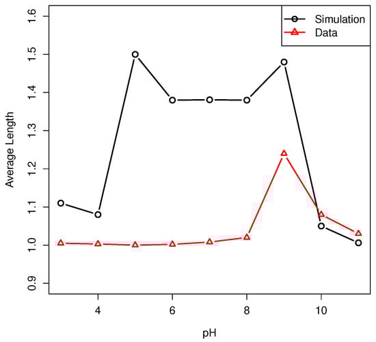 We performed an extensive comparison of the pH dependence of the predicted polypeptide length distribution with that reported in [8]. To summarize, the predicted enhancement of the amount of polypeptides produced in alkaline solution is in reasonable agreement with that reported in [8], but the model predicts a much higher enhancement in polypeptide formation in acid media than reported in [8]. In Figure 13, we show the average polypeptide length as reported in [8] and the corresponding result of the simulations to illustrate this result. The model pH dependence is parametrized by the experimental results in [33]. The solution chemistry appears to be nearly the same in the two sets of experiments reported in [8,33], and we were unable to determine the source of this discrepancy. It is discussed somewhat further in Section 6.