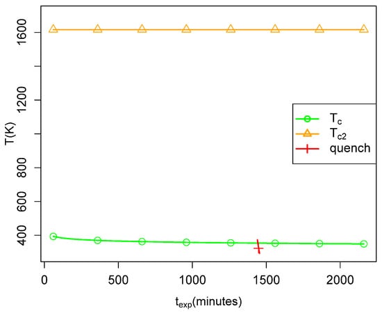 Temperatures of what we interpret as the fluid temperature before the quench taking place in the smokers were reported in [24] to be up to 530 K. pH values were acidic, in the range of 3.1 to 5.5. As in the laboratory experiments, the least well-known parameters are the width of the Gaussian distribution of barriers to hydrolysis and the dwell time of the fluids at high temperature before the quench. Glycine was the most common amino acid in the oceanographic samples, followed by serine, asperine, and lysine. This might suggest that the values of the width which were used to fit the laboratory data and the values of and as reported in [23] in glycine–glycine hydrolysis could be used, and we have applies them here. The dwell times of the fluids at high temperature before the quench are unknown for smokers, but models [39] suggest much longer times (on the order of up to years) than those experienced in the laboratory experiments. As noted earlier, larger values of lower the value of , so it is more likely that the temperature before quenching will exceed if the other parameters are the same.