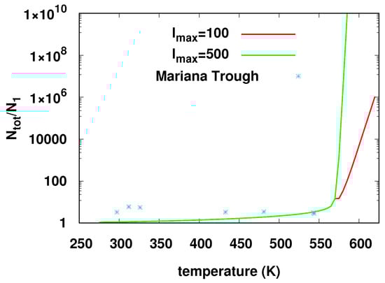 The ratio of the total number of amino acid molecules to the number of monomeric amino acids for two values of the maximum polymer length () in the model compared with values from observational oceanographic data from reference [24]. We took and here. The corresponding value of is 570.4 K. Above , the model value of the ratio diverges as . In the figure, one sees a slight decline in the ratio just above in the case of , which arises from the factor in Equation (6).