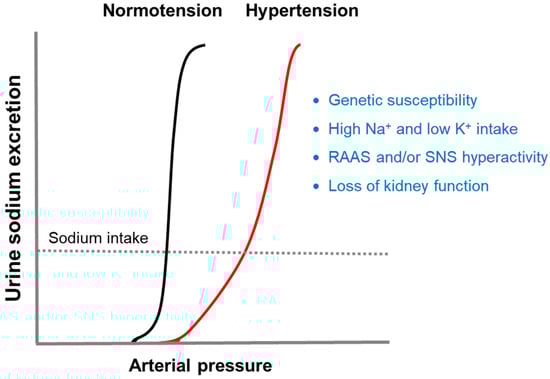 If the normal pressure-natriuresis curve shifts to the right, hypertension will occur due to impaired renal sodium excretion (Figure 1). Four major factors known to induce this alteration are genetic susceptibility, diet, neurohumoral activation, and loss of kidney function [11]. The following sections will discuss how these factors disrupt the pressure-natriuresis relationship.