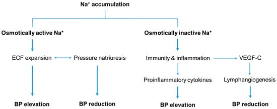 Sodium taken into the body is primarily localized in the extracellular space due to the activity of Na+/K+-ATPase, which is present in all cell membranes. To maintain the osmolality of extracellular fluid and cell volumes, sodium intake is typically accompanied by water retention. The resulting expansion of extracellular fluid and plasma volume can lead to hypertension if the mechanism of pressure-natriuresis fails to work. However, a certain portion of sodium is not confined to the extracellular space. After an increase in dietary salt, the excess sodium accumulates in the subcutaneous interstitium, binding to proteoglycans. This osmotically inactive Na+ storage contributes to regulating body sodium balance and blood pressure, as it can be drained through the lymphatics [23]. The increased interstitial tonicity activates the tonicity-responsive enhancer binding protein (TonEBP) in macrophages that infiltrate the interstitium of the skin. TonEBP transactivates the vascular endothelial growth factor C (VEGF-C) gene and enhances VEGF-C secretion by macrophages. This increases lymphatic capillary density and attenuates the blood pressure response to high salt [24].
