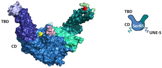 SerRS is a homodimeric enzyme. Each monomer is composed of the N-terminal tRNA-binding domain (TBD) and the globular C-terminal catalytic domain (CD) that is also responsible for dimerization (Figure 1) [47]. The CD consists of a seven-stranded β-sheet flanked by α-helices and contains three conserved motifs: motif 1 takes part in forming a dimer interface, while motifs 2 and 3 play a role in binding the ATP, amino acid, and 3′-end of tRNA [51]. The N-terminal TBD features an antiparallel coiled coil composed of two long α-helices, protruding away from CD. TBD recognizes the long variable arm of tRNASer [52,53] and directs the acceptor arm of tRNASer into the active site of the catalytic domain in the opposite subunit [54,55]. Therefore, tRNASer binds across both subunits. Animal mitochondrial SerRSs have evolved a unique dual mode for the recognition of two highly divergent mitochondrial tRNAsSer that do not possess a long variable arm typical for tRNAsSer [56,57]. Interestingly, in the mitochondria of protostome animals, SerRS is a heterodimer, where one subunit lacks TBD, while the other is catalytically inactive [58]. Another exception to the standard SerRS structure is the atypical non-canonical SerRS from methanogenic archaea, which contains Zn2+ in the active site involved in serine binding and significantly larger TBD with a completely different and unrelated fold compared to the conventional SerRS found in all three domains of life [59,60].