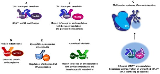 The versatility of protein–protein interactions of SerRSs from various organisms. (A) In the yeast Saccharomyces cerevisiae, SerRS forms a ternary complex with tRNASer and Trm140 methyltransferase, enabling tRNASer m3C32 modification. (B) Additionally, in S. cerevisiae SerRS, the C-terminal extension binds peroxin Pex21. This interaction modestly increases tRNASer aminoacylation and implicates a connection between translation and peroxisome biogenesis. (C) SerRS from the methanogenic archaea Methanothermobacter thermautotrophicus forms a complex network of protein–protein interactions. The SerRS:ArgRS complex enhances tRNASer aminoacylation and suppresses the aminoacylation of unmodified tRNAArg. The association of both aaRSs with ribosomal proteins of the P-stalk of the large ribosomal subunit implicates tRNA channeling. (D) In human mitochondria, the interaction of SerRS with methyltransferase METTL8 slightly stimulates tRNA m3C32 modification and enhances tRNASer aminoacylation. (E) In the fruit fly Drosophila melanogaster mitochondria, heterodimeric SerRS2 is composed of SerRS2α lacking a tRNA-binding domain and SerRS paralogue SLIMP with a defunct catalytic site. The interaction of SerRS2 with LON protease via SLIMP coordinates mitochondrial translation and replication. (F) In the plant Arabidopsis thaliana, the SerRS catalytic domain interacts with the N-terminal domain of BEN1 oxidoreductase, which modestly influences aminoacylation and suggests a link between translation and brassinosteroid metabolism.