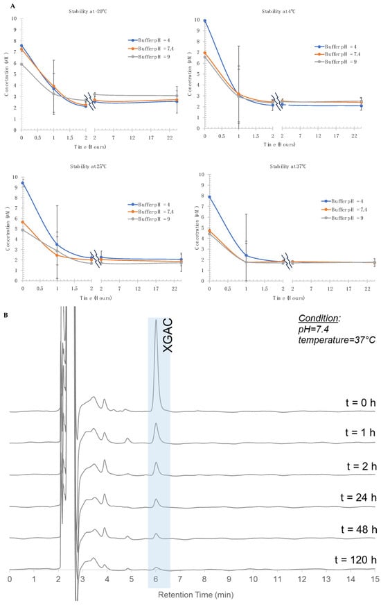 (A) Stability of XGAc at −20, 4, 25, and 37 °C versus time; values are expressed as mean ± standard deviation (n = 2); (B) Examples of an XGAc chromatogram, pH = 7.4 at 37 °C at different times.