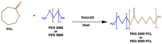 The amphiphilic PEG2000-PCL and PEG5000-PCL diblock copolymers were obtained by the ring-opening polymerization (ROP) method (Figure 2). The most commonly used catalyst is stannous octoate (Sn(Oct)2) [29,30]. The macroinitiator, methoxy polyethylene glycol (methoxyPEG), must be dried in a microwave [31], and a variety of hydrophobic building blocks, such as ε-caprolactone (PCL), have been used for the PMs formation [32,33,34].