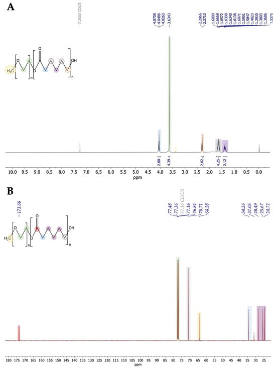 (A) 1H NMR spectrum (CDCl3) of PEG5000-PCL copolymers; (B) 13C NMR spectrum (CDCl3) of PEG5000-PCL copolymers.