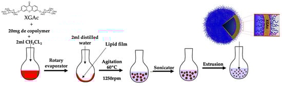 Figure 6C,D show the PEG2000-PCL and PEG2000-PCL-XGAc, respectively, obtained by the film rehydration method. It can be observed that the spherical shape of PEG2000-PCL was not modified with the presence of XGAc.