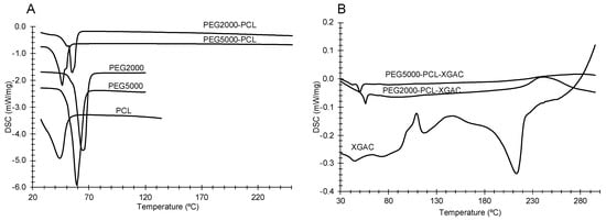 DSC thermograms of the PMs’ formulation components are shown in Figure 5A. For the PEG2000 and PEG5000, the onset temperatures were 60 °C and 52 °C, respectively. For the PCL, the onset was −11 °C. For the mixtures, PEG2000-PCL and PEG5000-PCL, the onset temperatures were 40 °C and 31 °C, respectively, showing that a small amount of PCL influenced the crystallization behavior of PEG. Nevertheless, the varied onset indicated that the crystalline structure for both PCL and PEG were altered. The pure XGAc and the PM formulations with XGAc are shown in Figure 5B. XGAc has an onset at 195 °C and the PEG2000-PCL-XGAc and PEG5000-PCL-XGAc PMs presented only a peak with an onset at 48 °C and 53 °C, respectively.