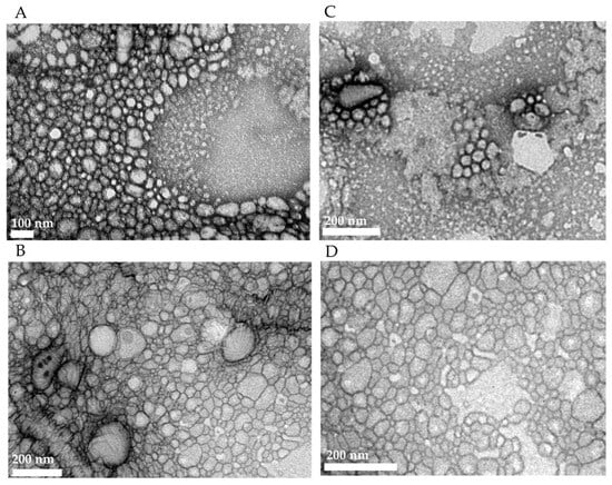 TEM images of (A) PEG5000-PCL formed by film rehydration; (B) PEG5000-PCL-XGAc formed by film rehydration; (C) PEG2000-PCL formed by film rehydration; (D) PEG2000-PCL-XGAc formed by film rehydration.