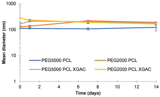 PEG5000-PCL particles’ sizes without XGAc did not present significant differences over time (p = 0.444). In contrast, one day after preparation, the PEG5000-PCL with XGAc increased the mean diameter from 164.23 nm to 211.77 nm (p = 0.049), 7 days after showed a mean diameter of 202.80 (p = 0.562), and after 14 days, the particles with and without XGAc presented mean diameters of 175.33 nm (p = 0.090) and 122.06 nm (p = 0.482), respectively.