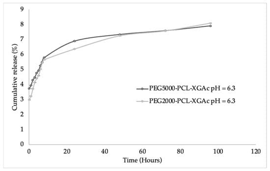 Regarding the release from PEG2000-PCL PMs, the XGAc release curve increases from 2.99% to 5.66% in the first 8 h, after 48 h it increases from 5.66% to 7.25%, and at 96 h it was released up to 8.09%.