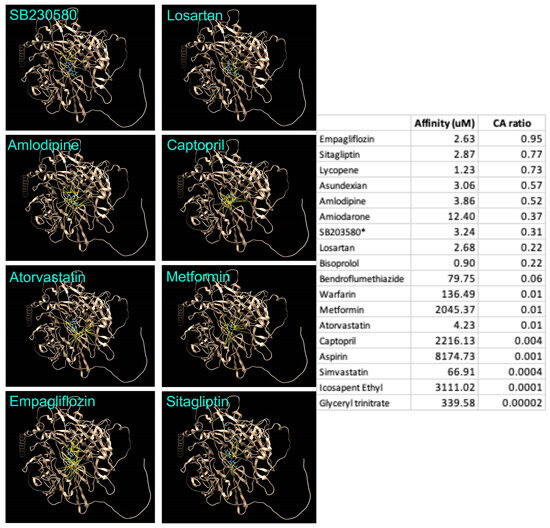 The binding sites of human SORT1 were identified using the PrankWeb: Ligand Binding Site Prediction tool (https://prankweb.cz/ (accessed on 15 September 2023)). To assess the targetability of SORT1 by small molecules, in this study, the molecular docking of selected drugs approved for the therapeutics of cardiovascular disease were evaluated against the AlphaFold structure of human SORT1 using AutoDock Vina 1.2.0. Briefly, the AlphaFold structure of SORT1 was optimised for molecular docking using AutoDock MGL tools. The isomeric SMILES sequence of the selected small molecules was obtained from the PubChem database and converted into the PDB format using the Chimera software (Chimera-1.17.3-mac64) following the optimisation of the structure for molecular docking [17,18]. The PDB structures of small molecules were further processed using the AutoDock MGL tools for molecular docking, as reported previously [15,16,17,18,19]. The SORT1 AlphaFold structure was also screened against our in-house compound library to identify a high-affinity inhibitor. Moreover, AF38469 and SB203580, which are reported to be orally bioavailable SORT1 inhibitors, were used as reference compounds [3,7,8,9]. To assess the targetability potential of SORT1 by the small molecules, the concentration affinity ratio (CA ratio) for each of the small molecules was calculated as described before [17,19].