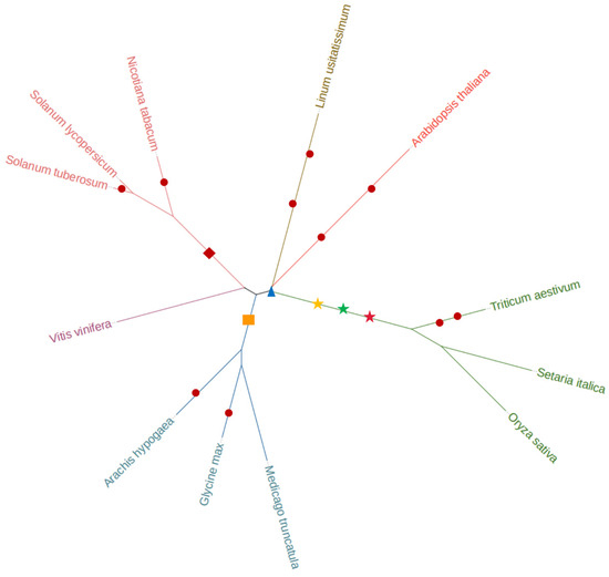 In this study, three gramineous plants, including wheat (Triticum awstivum), rice (Oryza sativa), and millet (Setaria italica); three leguminous plants, including soybean (Glycine max), cultivated peanut (Arachis hypogaea), and barrel medic (Medicago truncatula); three Solanaceae plants, including tomato (Solanum lycopersicum), potato (Solanum tuberosum), and tobacco (Nicotiana tabacum); the model plants Arabidopsis thaliana and outgroup grape (Vitis vinifera); and the drought-tolerant plant flax (Linum usitatissimum) were screened [22]. The genomic data of a total of 12 species were used in this study (Table 1).