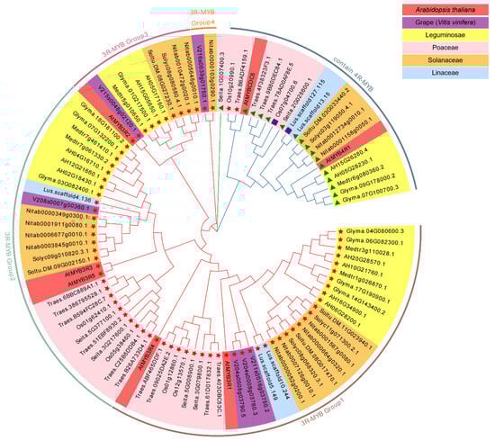 The phylogenetic algorithm of the OrthoFinder-2.5.4 software [27,28] was used to confirm the gene homology, and then STAG algorithm was used to construct a species tree. Taking the members of the 3R-MYB and 4R-MYB subfamilies with reduced numbers and conservative evolution as representatives, the genetic distance between these genes was calculated using a Neighbor-joining (NJ) algorithm, and a typical phylogenetic tree of members with typical MYB domains was constructed. The software used was MEGA-11 [29] and the bootstrap repeat value was 1000. The obtained phylogenetic tree was uploaded to the Evolview website [30] (http://www.evolgenius.info/evolview) (accessed from 1 January 2021 to 31 May 2023) for annotation and landscaping.