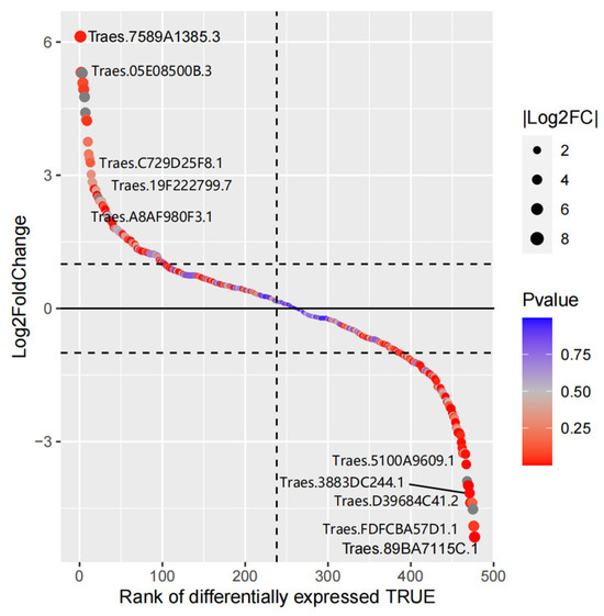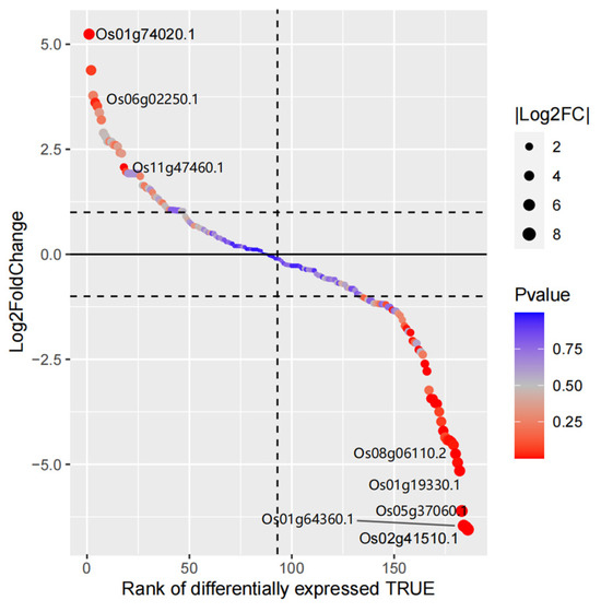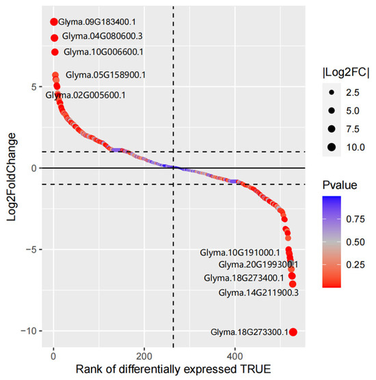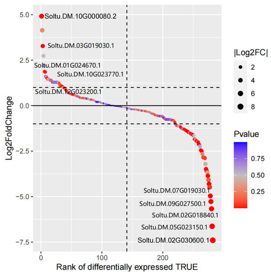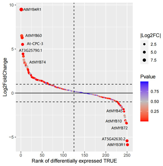 Gene differential expression sequencing of Arabidopsis thaliana MYB family members. Each circle represents one MYB family gene; the size of the circle represents the log2FoldChange value of the gene; and the color of the circle represents the p-value of the gene.
