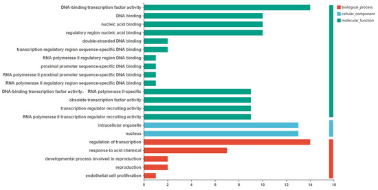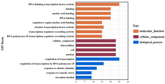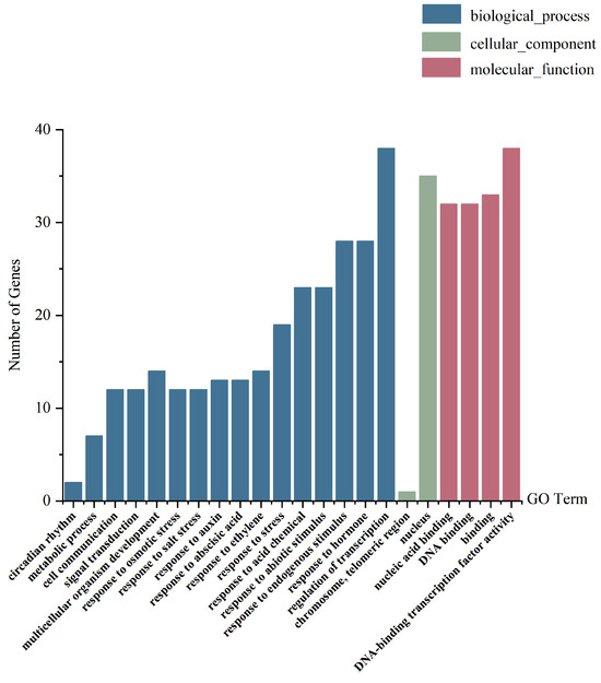 The DEGs of the Arabidopsis thaliana MYB family were annotated in GO and KEGG, and classified according to the results of the GO annotations (Figure 4). The results showed that there were 39 DEGs annotated for their molecular function and biological process. The annotated molecular functions were essentially related to DNA-binding transcription factor activity. For biological processes, the most frequently annotated term of GO was the regulation of transcription, which was in line with the basic function of the “transcriptional regulation” of transcription factors. The transcription regulation function of DEGs of the Arabidopsis thaliana MYB family may be triggered by external or internal stimuli, such as osmotic stress.