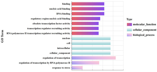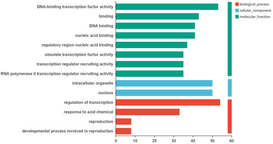 The results of the GO annotation for the DEGs in the wheat MYB family showed that some DEGs had the function of transcriptional co-regulator activity, because 35 DEGs were annotated under RNA polymerase II transcription regulator recruiting activity. In the latest interpretation of GO terms, the recruitment activities of these transcriptional regulators were all classified as being transcriptional co-regulator activity [35,36]. In addition, some DEGs were annotated under biological processes related to reproduction, for example, the Traes.429583AEC.1 gene was annotated under the stamen development process (Figure 6).