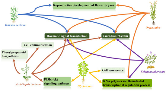 In this study, DEGs in the MYB family of five species under drought stress was annotated into the circadian rhythm pathway. Studies on Arabidopsis thaliana, soybean, millet, etc., have shown that there is a relationship between a plant’s response to abiotic stresses (such as heat, cold, and drought) and its circadian rhythm or biological clock [72]. For example, the research on Arabidopsis thaliana shows that TOC1 (timing of CAB expression 1) can serve as a molecular switch to connect the biological clock with the plant response to drought [73]. This phenomenon has also been observed in other studies of soybeans: that drought stress could affect the gene expression of biological clock components (LCL1-, GmELF4-, and PRR-like) [74]. In this study, the At-CCA1-16 gene of Arabidopsis thaliana (Supplementary Table S13), the Traes.19F222799.7 gene of wheat (Supplementary Table S14), the Os08g06110.2 gene of rice (Supplementary Table S15), the Glyma.03g2618004 gene of soybean (Supplementary Table S16), and the Soltu.DM.03G019030.1 gene of potato (Supplementary Table S17) belong to a group of homologous genes with CCA1 and LHY, which are known as rhythm factors [37]. In future breeding work, researchers can take these common MYB genes as the core, with the species-specific genes as the auxiliary, to further improve the breeding efficiency of drought-tolerant varieties.