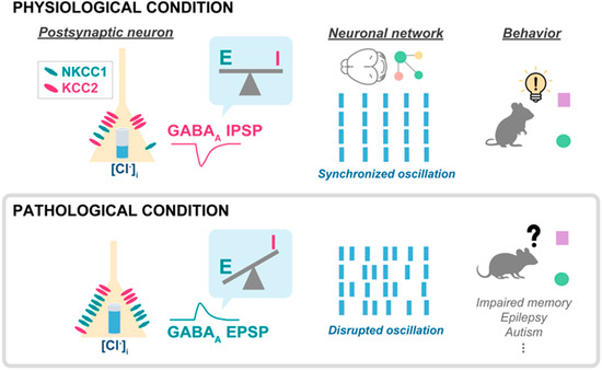 Why are changes in GABAA current reversal potential detected in so many different conditions? The proximity of the value of the GABAA current reversal potential and the resting membrane potential of most neurons is probably the critical factor. Such proximity means that even small changes in the intracellular chloride concentration can switch the current effect from hyperpolarizing to depolarizing; this is a unique property of the GABAA channel and sets it apart from other synaptic receptors. Another reason might be the intrinsic complexity and plasticity of the regulatory mechanisms. Intracellular chloride concentration changes significantly during development because the regulating machinery is heavily modulated by numerous mechanisms (including epigenetic [80]); this makes this process particularly sensitive to even small functional abnormalities. Therefore, we hypothesize that alterations in GABAA reversal potential (either in the depolarizing or hyperpolarizing direction) in the cerebral cortex represent a common maladaptive mechanism leading to cognitive impairment in multiple pathological conditions with different etiologies.