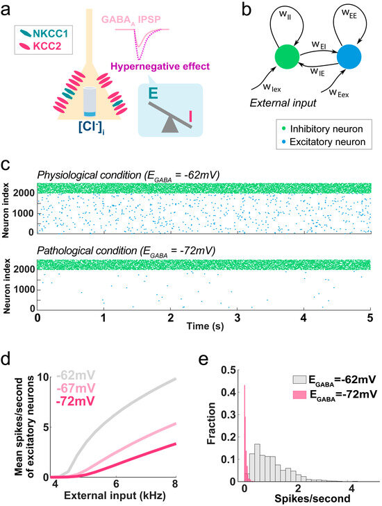 Effect of hypernegative GABAA current on network function. (a) When the neuronal KCC2-NKCC1 activity ratio is increased, intracellular chloride concentration ([Cl−]i) is lower than the physiological level, and the inhibitory effect of GABAA current is strengthened, disrupting the E/I balance. (b–e) Simulated effects of hypernegative GABAA current on cortical network activity. In pathological conditions (GABAA reversal potentials = −72 mV), the spike frequency of the postsynaptic excitatory neurons is severely decreased, even when the frequency of the inhibitory inputs is unaffected. (b) Computational model of a cortical network based on local microcircuit of excitatory–inhibitory recurrent architecture. (c) Simulated spontaneous spiking activity of excitatory (blue) and inhibitory (green) cortical neurons with physiological (−62 mV, top panel) or pathologically hyperpolarized (−72 mV, bottom) GABAA reversal potentials. (d) Average firing rate of excitatory neurons with three different GABAA reversal potentials in response to variable external input frequencies. (e) Histogram of firing rates of excitatory neurons when the external input was set at 4.5 kHz. (Adapted with permission from [16]).