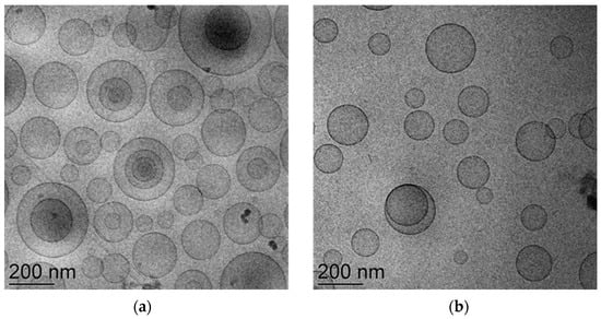 As shown in the micrographs, the PC double layer organization gave rise to spherical vesicles, particularly the ETO-NUT0.3 vesicles were oligolamellar (Figure 1a), while in the case of T-ETO-NUT0.3 unilamellar vesicles were detectable (Figure 1b), suggesting that the surfactant T80 slightly affected the vesicle structures.
