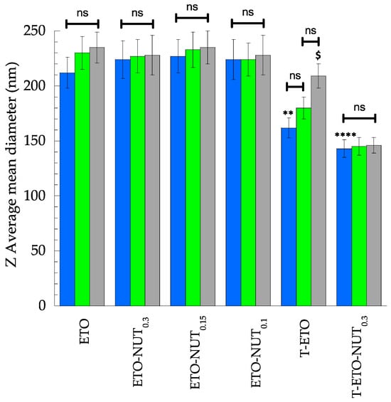 ) days after preparation. ** p < 0.01 T-ETO D1 vs. ETO D1; **** p < 0.001 T-ETO-NUT0.3 D1 vs. ETO D1 and $ p < 0.05 T.ETO D90 vs. T-ETO D1 by 2-way ANOVA followed by Tukey’s post hoc comparison test; ns: not significant.