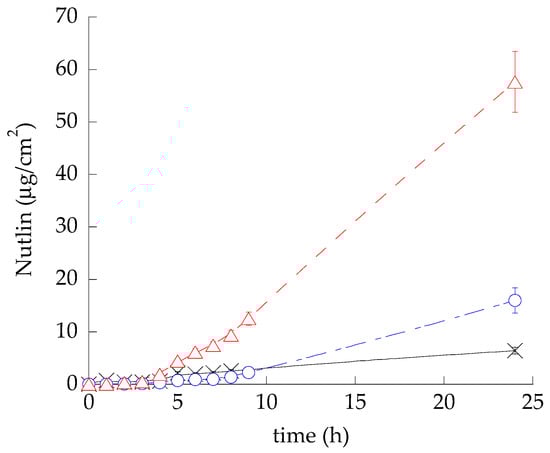 Nutlin-3-a ((-)-4-(4,5-bis(4-chlorophenyl)-2-(2-isopropoxy-4-methoxyphenyl)-4,5-dihydro-1H-imidazole-1-carbonyl) piperazin-2-one, NUT, 98% ee) was synthesized following the procedure reported in the literature [27,28]. Polysorbate 80 (polyoxyethylenesorbitan monooleate, tween 80, T80) was purchased from Sigma-Aldrich (St Louis, MO, USA). The soybean lecithin (PC) (90% phosphatidylcholine) was Epikuron 200 from Lucas Meyer (Hamburg, Germany). STRAT-M® membranes (STRAT-M) were purchased from Merck-Sigma Aldrich (Milan, Italy). Solvents were of HPLC grade, and all other chemicals were of analytical grade.