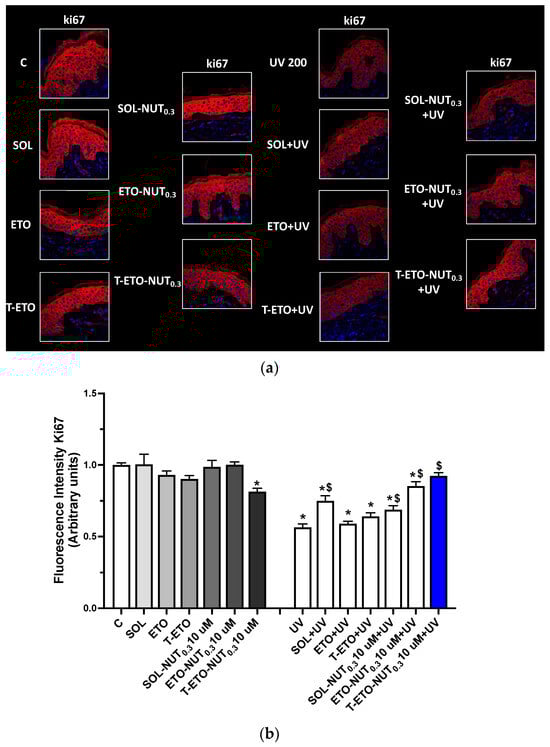 (a) Ki67 expression levels (red staining) in human skin biopsies treated with unloaded forms (SOL, ETO, T-ETO) or loaded with NUT0.3 (SOL-NUT0.3, ETO-NUT0.3, T-ETO-NUT0.3) at the dose of 10 µM for 4 days and exposed to UV 200 mJ/cm2 for 3 days. Blue staining (DAPI) represents nuclei. (b) Graphical representation of the fluorescence intensity levels of ki67 quantified using ImageJ software; original magnification at 40×. The data are expressed as the mean of three different experiments; * p < 0.05 T-ETO-NUT0.3 10 µM, UV, SOL-UV, ETO + UV, T-ETO + UV, SOL-NUT0.3 10 µM + UV, ETO-NUT0.3 10µM + UV) vs. C; $ p < 0.05 SOL + UV, ETO-NUT0.3 10 µM + UV, T-ETO-NUT0.3 10 µM + UV vs. UV by 2-way ANOVA followed by Tukey’s post hoc comparison test.