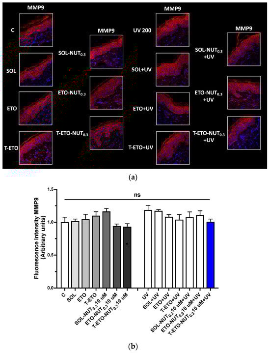 UV radiation can promote the activation of metalloproteinases (MMPs) as MMP9, a proteolytic enzyme implicated in the degradation of proteins belonging to the extracellular matrix (ECM) as collagen, elastin, etc., resulting in skin structure damage and premature extrinsic aging [43,44]. Therefore, we tested whether the NUT-loaded nanovesicular systems could prevent UV-induced MMP9. Our results show that exposure to UV radiation could promote a slight activation of MMP9 compared to control tissues, as depicted by increased fluorescent levels of the proteolytic enzyme (Figure 5a,b). Notably T-ETO-NUT0.3 could restore MMP9 levels at basal condition, whereas SOL-NUT0.3 and ETO-NUT0.3 did not display any protective effect against the UV damage. This data might indicate that T-ETO compared to ETO could represent a promising delivery system to deliver NUT0.3 within the skin to protect UV-induced skin aging.
