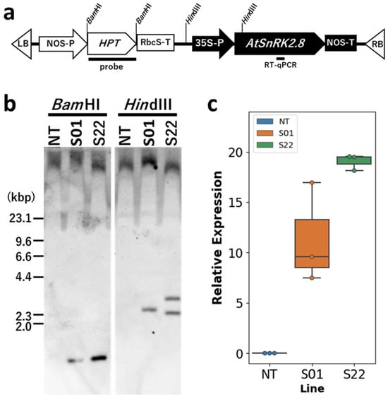 Two genetically independent clonal transgenic lines, i.e., S01 and S22, overexpressing AtSnRK2.8 were used for this study (Figure 1). It was confirmed that S01 has 1 copy of T-DNA containing the AtSnRK2.8 expression cassette while the S22 has 2 copies (Figure 1b). The expression level of AtSnRK2.8 in S22 was also higher than S01 (Figure 1). It could be considered that AtSnRK2.8 driven by the CaMV35S promoter in the transgenic poplars were transcribing in whole body of plant independent from stress condition.