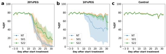 Fluctuations in QY during the stress treatments. Fluctuations in QY under 20% PEG, 10% PEG, and control treatments were shown in (a,b,c), respectively. Graphs were plotted by mean values of each measurement, and orange, green, and blue plots were shown that of transgenic S01 line and S22 line, and non-transgenic line (NT), respectively. Five individual plants were prepared for each combination of lines and treatments. Plots and shaded areas indicated mean and 95% confidence intervals, respectively.