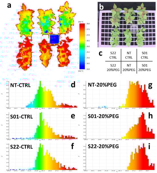 Leaf surface temperature on day 8 after start of the treatment. (a) The thermography image of transgenic and non-transgenic poplars in 20% PEG treatment and control, 8 days after the start of the treatments. (b) The bright image corresponding to the thermography image. (c) The sample layout of the thermography image. (d–i) Histograms showing temperature distribution for each combination of lines and treatments. The temperature distribution of the NT, S01, and S22 lines in the control treatment plots are shown in (d,e,f), respectively. The temperature distributions of the NT, S01, and S22 lines in the 20% PEG treatment experimental plots are shown in (g,h,i), respectively. Histogram colors match those in (a).