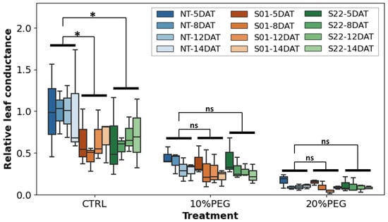Leaf conductance during the stress treatments. Boxplots were shown leaf conductance measured at 5, 8, 12, and 14 days after the start of the treatments. Blue, orange, and green box plots show the leaf conductance of non-transgenic (NT), transgenic S01 line, and S22 line, respectively. Statistical tests were performed by the analysis of variance (ANOVA), and only combinations for which significant differences (α = 0.05) were detected were annotated with * in the graph (‘ns’ indicate no significance).