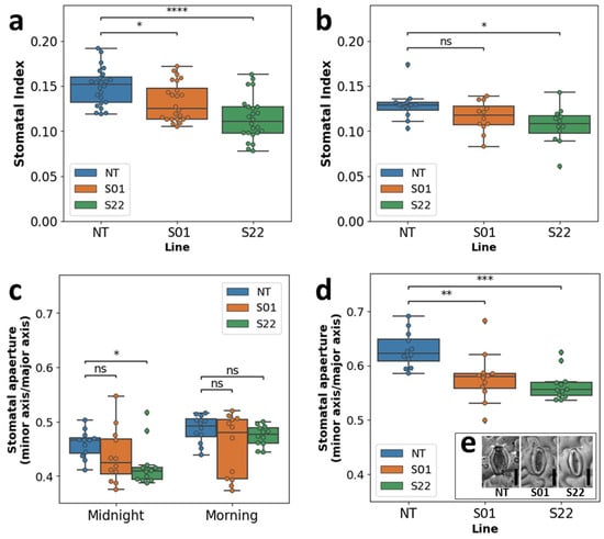 Stomatal index and aperture under the non-stress condition. Stomatal indexes of plants grown in the netted greenhouse and in vitro were shown as box plots and bee swarm plots in (a,b), respectively. The stomatal aperture of plants grown in the netted greenhouse and in vitro were shown as box plots and bee swarm plots in (c,d), respectively. Photos shown in (e) typical stomata of respective NT, S01, and S22 plant in vitro. Statistical tests were performed by Mann-Whitney U tests. *, **, ***, and **** indicate a significant difference (α = 0.05, 0.01, 0.001 and 0.0001, respectively) between respective samples, ‘ns’ indicate no significance (α = 0.05).