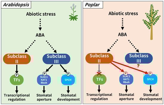 As mentioned previously, subclass II SnRK2 targeted transcription factors that regulate stress-responsive gene expression in Arabidopsis rather than proteins associated with regulating stomatal behavior [40]. Moreover, it was known that subclass II SnRK2 outputs a stress-responsive gene expression as a downstream output, not only in Arabidopsis, a dicotyledonous herbaceous plant, but also in monocotyledonous herbaceous plants such as rice and wheat [41,42]. Thus, this present study first reported that subclass II SnRK2 kinase may regulate both stomatal aperture and differentiation in poplar. The reported phenotype of transgenic Arabidopsis plants overexpressing genes coding poplar subclass II SnRK2 kinase were very similar to that of the transgenic poplar overexpressing genes coding Arabidopsis subclass II SnRK2 kinases, which slightly restores abiotic stress tolerance without major changes in the transcriptome [22]. Based on these facts, we propose a working hypothesis that in sharp contrast to Arabidopsis, subclass II SnRK2 in poplar are involved in stomatal regulation as the downstream output (Figure 6). On the other hand, there is little experimental knowledge regarding the function of endogenous subclass II SnRK2 kinases in poplar which requires to be supplemented in the future. This is the same case for the endogenous subclass III SnRK2 kinases of the plant. It has been reported that the abiotic stress tolerance of Arabidopsis overexpressing poplar subclass III SnRK2 was not different from that of non-transgenic Arabidopsis, but there are no reports on the number of stomata or aperture [22]. We expect that the working hypothesis proposed here will be validated in the future as our understanding of endogenous subclass II and subclass III SnRK2 kinases in poplar increases.