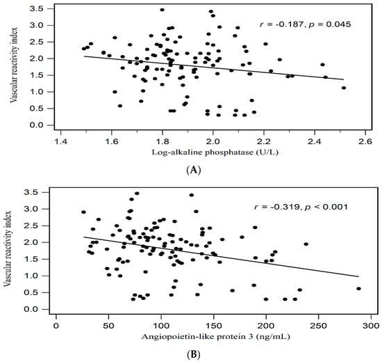 Relationships between VRI and (A) log-transformed alkaline phosphatase (log-ALP), and (B) ANGPTL3 among patients with MHD.