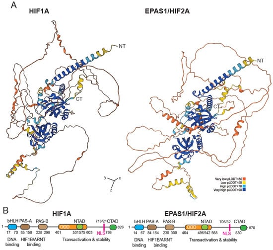 Figure 1. HIF1A and HIF2A/EPAS1 proteins. (A) AlphaFold prediction of HIF1A and HIF2A/EPAS1. The colours indicate the different per-residue confidence score (pLDDT) as indicated. Some regions below 50 pLDDT may be unstructured in the isolation. https://alphafold.ebi.ac.uk. (B) Schematic representation of HIF1A and HIF2A/EPAS1. Both proteins contain basic helix–loop–helix (bHLH) and Par-Arnt-SIM (PAS) transcription factor domains that facilitate the heterodimerization with ARNT. They also have N- and C-terminal transactivation domains (N/C-TAD), an oxygen-dependent degradation domain (ODD), and nuclear localization sequence (NLS). Their sequences show a high degree of similarity; amino-terminal (NT) and carboxy terminal (CT).
