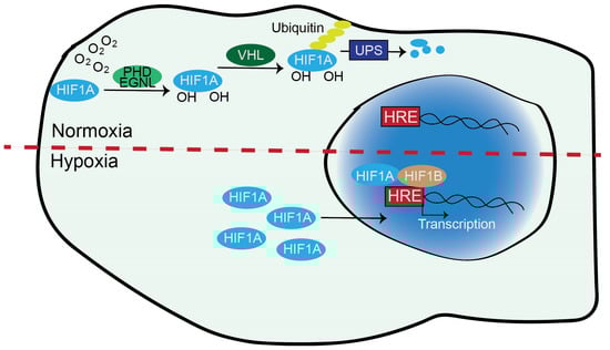 When the O2 content decreases, hydroxylation cannot take place, and HIF1A/EPAS1/HIF2A rapidly accumulate. After dimerization, the mature TFs migrate into the nucleus and bind to E-box-like hypoxia response elements (HREs) in the promoter region of hundreds of target genes (Figure 2). These genes represent the hypoxia response, and HIFs support their transcription and adaptation to the altered environment [15]. Control by the ubiquitin–proteasome system (UPS) is a key mechanism for cellular adaptation to varying O2 concentrations.