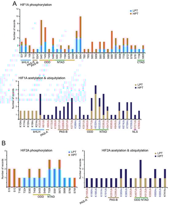 Figure 3. Phosphorylated, acetylated, and ubiquitylated sites in human HIF1A and EPAS1/HIF2A. (A) Phosphorylated, acetylated, and ubiquitylated sites in human HIF1A, determined by PhosphoSitePlus https://www.phosphosite.org/proteinAction.action?id=4987&showAllSites=true (accessed on 14 November 2023). HTP: Number of records in which the specific PTM was only detected by mass spectrometry. LPT: number of records where the specific PTM was experimental demonstrated without mass spectrometry [20]. The different domains are indicated. (B) Phosphorylated, acetylated and ubiquitylated sites in human EPAS1/HIF2A, determined by PhosphoSitePlus https://www.phosphosite.org/proteinAction.action?id=4986&showAllSites=true (accessed on 14 November 2023). HTP: number of records in which the specific PTM was only detected by mass spectrometry. LPT: number of records where the phosphorylation was experimental demonstrated without mass spectrometry [20]. The different domains are indicated.