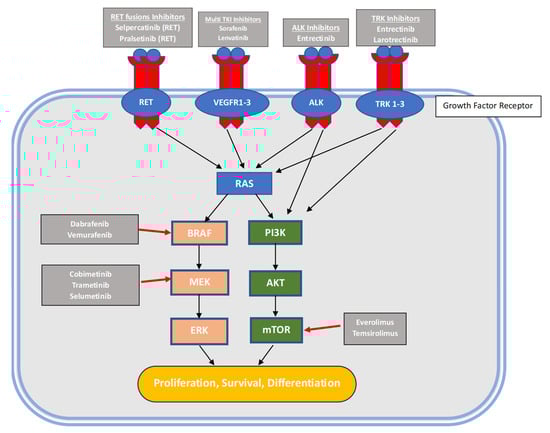 TRK fusions are found in 2% of adult patients diagnosed with PTC but are higher in pediatric and young adult PTCs, where they account for about 6–15% of all PTCs [29,30,31]. TRK is normally expressed in embryogenesis and in adult life it takes part in neurological functions such as pain, proprioception, appetite, and memory. TRK fusions lead to overexpression of the chimeric protein, resulting in constitutively active, ligand-independent downstream signaling which promotes carcinogenesis.