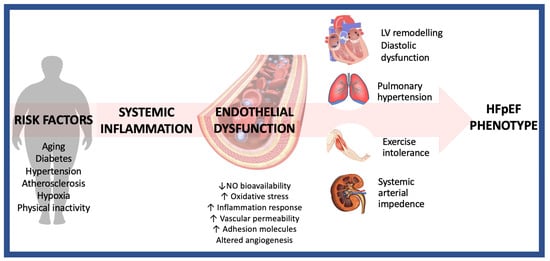 Heart failure (HF) is a clinical syndrome caused by structural and/or functional abnormalities of the heart, resulting in elevated intracardiac pressures and/or inadequate cardiac output [1]; traditionally, HF is classified, based on the measurement of left ventricular ejection fraction (LVEF), in two main types: HF with reduced EF (HFrEF)—observed in patients with LVEF < 40%—and HF with preserved EF (HFpEF)—observed in patients with LVEF > 50%. Despite the vascular system playing a crucial role in the development and progression of HF regardless of the ejection fraction, in the last years, a growing body of evidence focused the interest of the scientific community on the association between endothelial function and HFpEF. Endothelial dysfunction (ED)—defined as the impairment of the complex balance in endothelial function—plays a critical role in the pathophysiology of HF [2]. The main manifestations of ED (i.e., impaired endothelium-dependent vasodilation, increased oxidative stress, chronic inflammation, leukocyte adhesion, and endothelial cell senescence) affect the systemic and pulmonary haemodynamics as well as the renal and coronary circulation [3]. The present review aims to highlight the contribution of ED to the pathophysiology of HF, its role in HF patients, and the potential effects of pharmacological and non-pharmacological approaches. For this purpose, relevant data from a literature search (PubMed, Scopus, EMBASE, and Medline) were reviewed.
