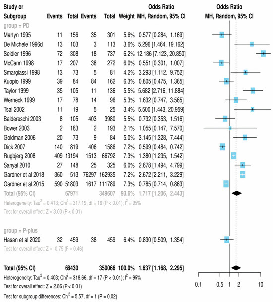 The overall odds ratio for all conditions, including Parkinson’s disease and Parkinson plus syndromes, was 1.637 (95% CI: 1.065–2.515), with z = 2.86 and p = 0.01, indicating a significant association between mild traumatic brain injury and the development of these conditions. The forest plot of the odds ratios for individual studies is shown in Figure 3. Sensitivity analyses were performed by excluding individual studies one at a time, and the results did not change substantially.