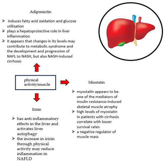 In patients with liver disease, hepatocyte dysfunction, impaired urea cycle, constipation, and intestinal dysbiosis contribute to hyperammonemia. The increased absorption of ammonia by skeletal muscle contributes to the development of sarcopenia. Muscle hyperammonemia results in increased myostatin expression and decreased activation of nuclear factor kappa B (Nf-B). As a result, impaired muscle protein synthesis occurs [159]. Myostatin is a negative regulator of muscle mass, which plays a key role in the development and maintenance of skeletal muscle mass [160]. Mutations or genetic disorders resulting in myostatin atrophy cause skeletal muscle hypertrophy [161]. Myostatin appears to be one of the mediators of insulin resistance-induced skeletal muscle atrophy [103,162]. In addition, in patients with cirrhosis, significantly elevated levels of ammonia can increase myostatin expression. Hyperammonemia appears to be an important inducer of sarcopenia by affecting the increase in myostatin [163]. Nishikawa et al. showed that high myostatin levels in patients with cirrhosis were correlated with lower survival rates [164]. In contrast, irisin is a myokine that is produced in response to exercise. It is responsible for fat-browning and thermogenesis [165]. Additionally, it exhibits anti-inflammatory effects in the liver and activates liver autophagy [166]. In addition, Zhao et al. showed that irisin is associated with sarcopenia in patients with cirrhosis [167]. Kosmalski et al. suggest that irisin can be used as a diagnostic marker for NAFLD, as it is associated with biochemical and anthropometric parameters related to liver function [168]. Wu et al. showed that irisin treatment can reduce age-related skeletal muscle fibrosis [169]. On the contrary, Zhu et al. have shown that increasing irisin levels through physical activity can reduce inflammation in NAFLD [170]. Adiponectin is one of the most common adipokines in human plasma. It is produced and secreted primarily by white adipose tissue [171]. Adiponectin induces fatty acid oxidation and glucose utilization [172]. In addition, it exhibits anti-inflammatory effects. In liver inflammation, it plays a hepatoprotective role [173]. It appears that changes in their levels can contribute to the development of MS, the development and progression of NAFL to NASH, and also NASH-induced cirrhosis [174,175]. The myokines described above are shown in Table 2.
