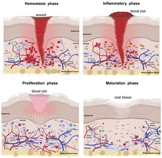 Skin wound healing involves a series of intricate steps and sequences of multi-cellular interplays, in which secreted cytokines and chemokines ensure efficient tissue repair and regeneration (Figure 1). Usually, the wound healing process falls into four consecutive phases [3].