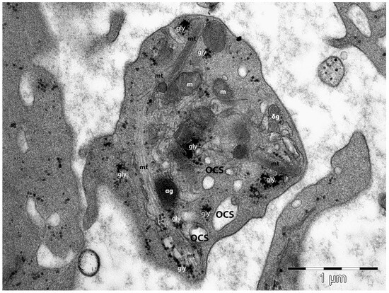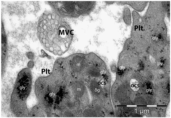 Transmission electron microscopy image of two neighbouring platelets (Plt1 and Plt2). Plt1 is in close proximity to a just-shedded multivesicular cargo (MVC)—a complex group of platelet-derived membrane-bound structures that activate and regulate intercellular pathways. MVC are vectors of transport for nucleic acids, proteins, and lipids, regulating the local microenvironment (but also remotely) with implications in cellular functions’ modulation or tissue regeneration/repair. gly—glycogen; m—mitochondria; OCS—open canalicular system. (Courtesy of Dr. E.T. Fertig, “Victor Babeş” National Institute of Pathology, Bucharest, Romania).