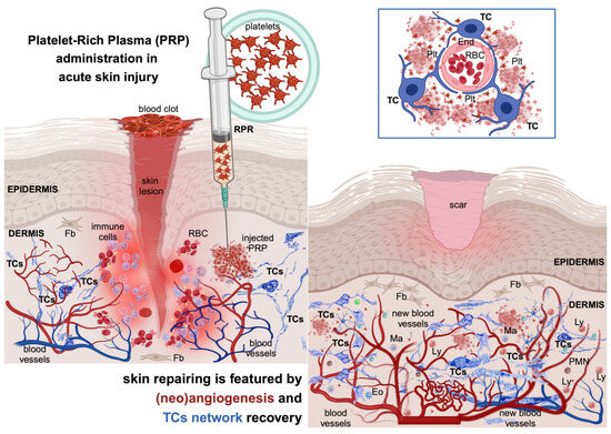 The skin’s recognised functions may undergo physiological alterations due to ageing, manifesting as varying degrees of facial wrinkles, diminished tautness, density, and volume. Additionally, these functions can be disrupted (patho)physiologically through various physical and chemical injuries, including surgical trauma, accidents, or chronic conditions like ulcers associated with diabetes mellitus, venous insufficiency, or obesity. Advancements in therapeutic interventions that boost the skin’s innate regenerative abilities could significantly enhance patient care protocols. The application of Platelet-Rich Plasma (PRP) is widely recognized for its aesthetic and functional benefits to the skin. Yet, the endorsement of PRP’s advantages often borders on the dogmatic, with its efficacy commonly ascribed solely to the activation of fibroblasts by the factors contained within platelet granules. PRP therapy is a cornerstone of regenerative medicine which involves the autologous delivery of conditioned plasma enriched by platelets. This is achieved by centrifugation, removing erythrocytes while retaining platelets and their granules. Despite its widespread use, the precise sequences of cellular activation, the specific cellular players, and the molecular machinery that drive PRP-facilitated healing are still enigmatic. There is still a paucity of definitive and robust studies elucidating these mechanisms. In recent years, telocytes (TCs)—a unique dermal cell population—have shown promising potential for tissue regeneration in various organs, including the dermis. TCs’ participation in neo-angiogenesis, akin to that attributed to PRP, and their role in tissue remodelling and repair processes within the interstitia of several organs (including the dermis), offer intriguing insights. Their potential to contribute to, or possibly orchestrate, the skin regeneration process following PRP treatment has elicited considerable interest. Therefore, pursuing a comprehensive understanding of the cellular and molecular mechanisms at work, particularly those involving TCs, their temporal involvement in structural recovery following injury, and the interconnected biological events in skin wound healing and regeneration represents a compelling field of study.