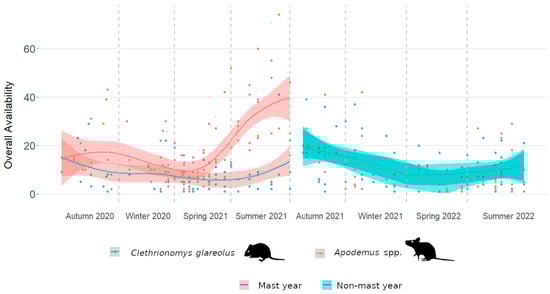 Apodemus mice and bank voles were more frequent, their availability increased overall [
