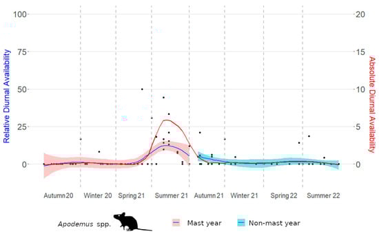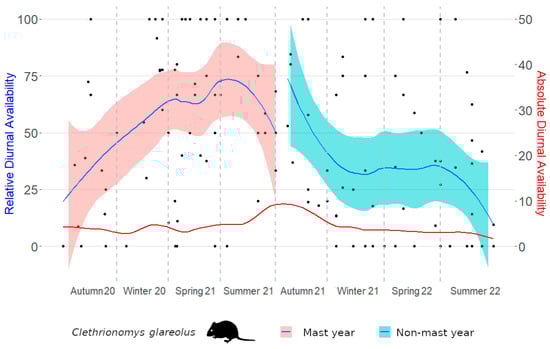 33]. It was not until bank voles themselves reached a small population peak in the autumn of 2021 that absolute diurnal availability increased. By this time, the population of