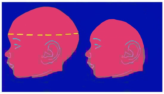 Congenital Zika syndrome is the most severe complication that can occur during pregnancy in women infected with ZIKV; fetuses, regardless of whether the mother is symptomatic or not, have a 5–14% risk of developing CZS and a 4–6% risk of presenting microcephaly [32]. The risk of developing CZS is higher in the first trimester of pregnancy (8–15%), compared to the following two trimesters (4–5%) [32]. The main signs and symptoms associated with the congenital Zika syndrome were microcephaly, parenchymal or cerebellar calcifications, ventriculomegaly, central nervous system hypoplasia or atrophy, arthrogryposis, ocular findings in the posterior and anterior segments, abnormal visual function, and low birthweight for gestational age [37,38,39]. Microcephaly is the first and most notable anomaly found at birth in children born to mothers with ZIKV infection, as it is observed at birth in approximately 80% of children. Microcephaly is defined as a condition where the head circumference of newborns falls below the normal age- and sex-specific standards. Specifically, microcephaly is diagnosed when the head occipitofrontal circumference is below two standard deviations for gestational age and sex, according to the INTERGROWTH-21 standard [36], below the average in relation to sex and gestational age; in the most severe forms, HC can be less than three SDs below the average. Alongside microcephaly, or sometimes even in its absence, brain anomalies may be present, resulting from an interruption of brain development during gestation with consequent skull collapse and disturbance of neuronal and glial migration [32,40]. In a study with seventy-one Brazilian children with prenatal ZIKV infection, the most common abnormalities included calcifications (especially in the cortico-subcortical junction of the white matter), malformations of the cortex, ventriculomegaly, reductions in brain volume, cerebellar hypoplasia, and corpus dysgenesis callosal [41]. Additional brain anomalies that are found, although less frequently, are cerebellar hypoplasia, lissencephaly, and pachygyria (abnormalities in cerebral convolutions) [32]. In addition to microcephaly, other abnormalities associated with congenital ZIKV infection include low birth weight, excessive scalp skin, facial disproportion, swallowing difficulties, hypertonia/spasticity, tremors/convulsions, and hearing impairments. These conditions can result from tissue damage, particularly during the first three months of gestation, resulting in anomalies of macroscopic (malformation disruption) and microscopic (dysplasia) development of the central nervous system, frequently associated with microcephaly [42].